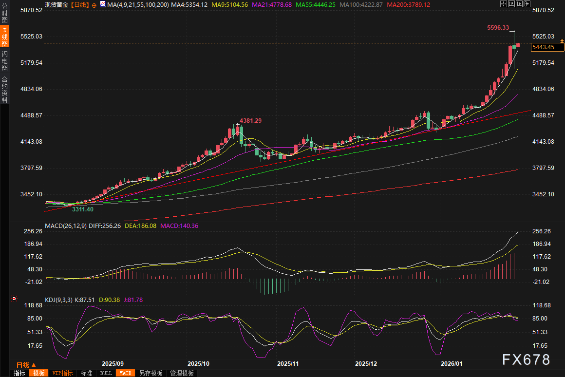 黄金价钱在本周四履历了剧烈的波动,现货金一度飙升至5596.33好意思元/盎司的历史新高,但随后急转直下,一度下落逾5%,波及5104.98好意思元的盘中低点,最终收报5377.14好意思元/盎司,跌幅收窄至约0.7%。这种冲高回落的状貌,主要源于投资者在创记载高位后的赢利了结活动。高岭期货金属往来总监大卫·梅格尔指出,贵金属近期创下历史新高后,正面对一场荼毒的抛售潮,这反应出市集短期过热的情感开释。
