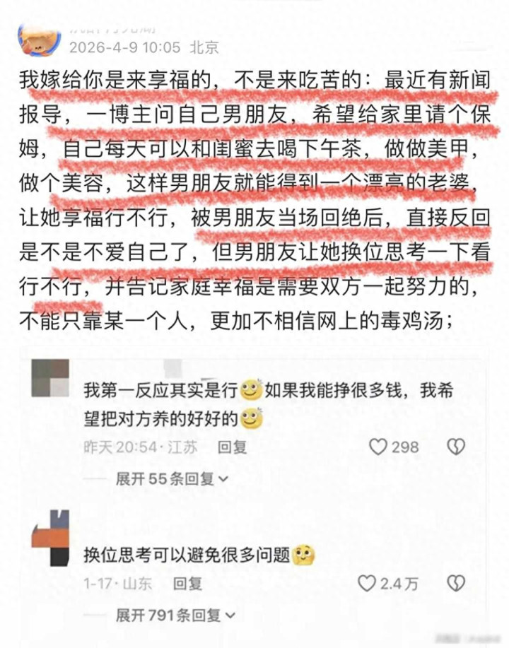 最近网崇高传一段灌音,内部有个女生对男一又友说,成婚以后要请个全职保姆,她策画每天作念好意思容、喝下昼茶、作念好意思甲,以为嫁东谈主等于来享福的,不是来受罪的,男生听完径直停止,说婚配是两个东谈主沿途过日子,不是你用钱我出力,女生随即问他是不是不爱我方,男生让她换位想考一下,这段视频三天播放了五千八百万次,辩论区王人炸开锅了。