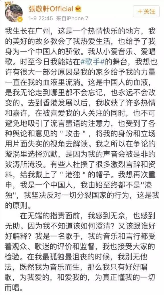 据悉,45岁的张敬轩是广州东谈主,2002年到香港发展,他在2012年到2015年技能,屡次发表失当言论,2017年复返内地投入《我是歌手》,因被收敛而退赛,那时官媒径直点名月旦,张敬轩则透过微博否定我方是港独,但网友并不买账。