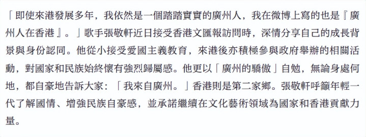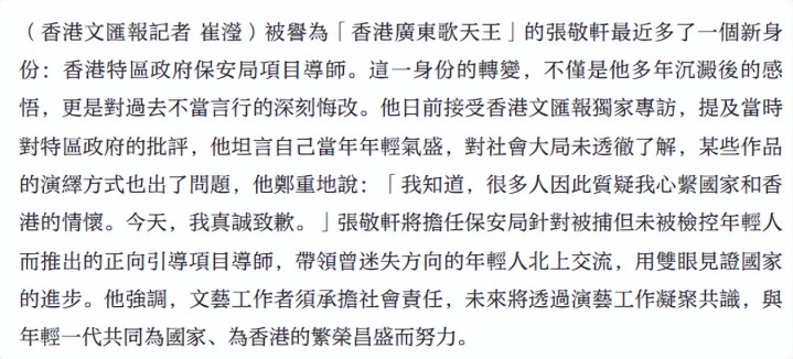 在香港发展24年的歌手张敬轩,初度就往日的言论谈歉,继承香港保安局的委任,担任“正向相似”的面目导师,计算上半年带团到内地交流,让香港年青东谈主眼力国度茂密。