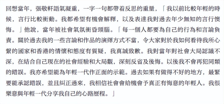 关于张敬轩的谈歉,不少东谈主表见知错能改善莫大焉,况且有保安局背书,但愿他会给那些仍是迷濛而犯下诞妄的香港年青东谈主带来正面积极的作用,这亦然他真挚谈歉的内容兴味兴味。