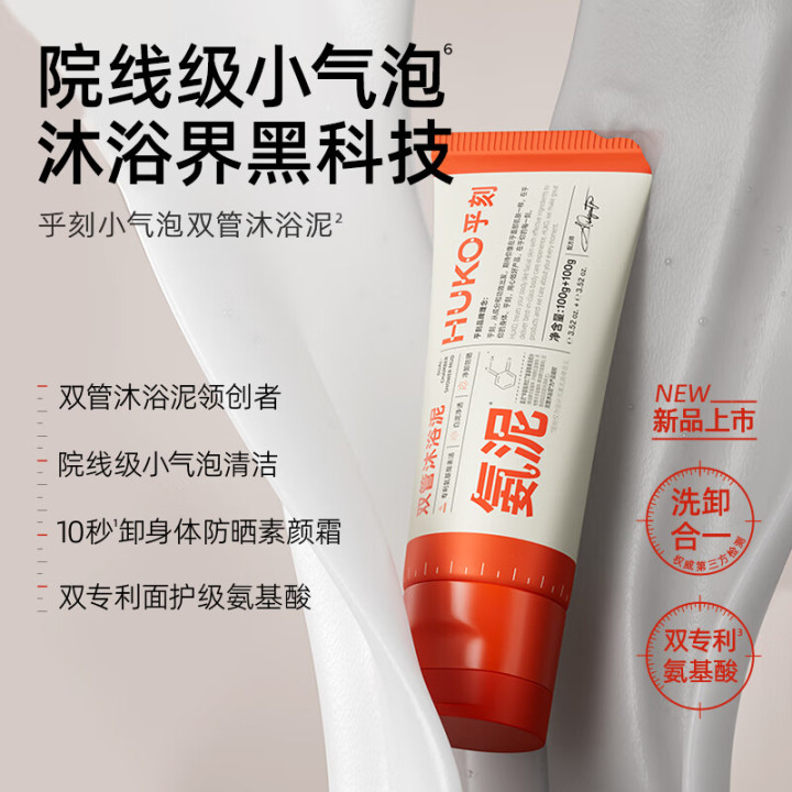 乎刻氨基酸白泥透净双管沐浴露:清洁力深刻,尤其针对油脂和防晒残留,洗后是表示不拔干的肤感。