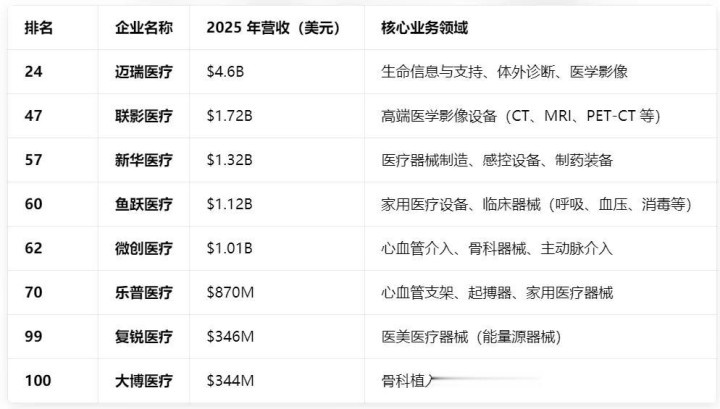 除迈瑞、联影两大龙头外,新华医疗(57位,13.2亿好意思元)、鱼跃医疗(60位,11.2亿好意思元)、微创医疗(62位,10.1 亿好意思元)、乐普医疗(70位,8.7亿好意思元)、复锐医疗(99位,3.46亿好意思元)、大博医疗(100位,3.44亿好意思元)也告捷入围百强,遮掩了空洞器械、家用医疗、心血管介入、医好意思、骨科等多个细分赛说念,展现出洋产医疗器械全产业链的成长活力。