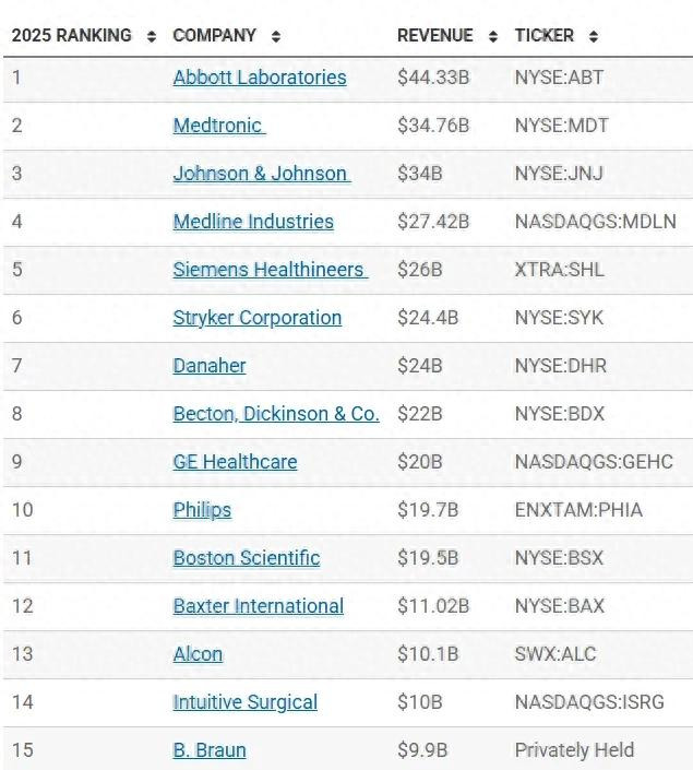 本次榜单前15名席位被西洋企业全面包揽,造成了难以撼动的行业壁垒。其中,雅培以443.3亿好意思元的医疗器械营收登顶人人第一,好意思敦力、强生疏别以347.6亿好意思元、340亿好意思元紧随自后,稳居人人前三。从榜单数据来看,名次前十的企业营收均突破190亿好意思元,其中雅培、好意思敦力、强生三大巨头营收超300亿好意思元,展现出完全的限制上风。
