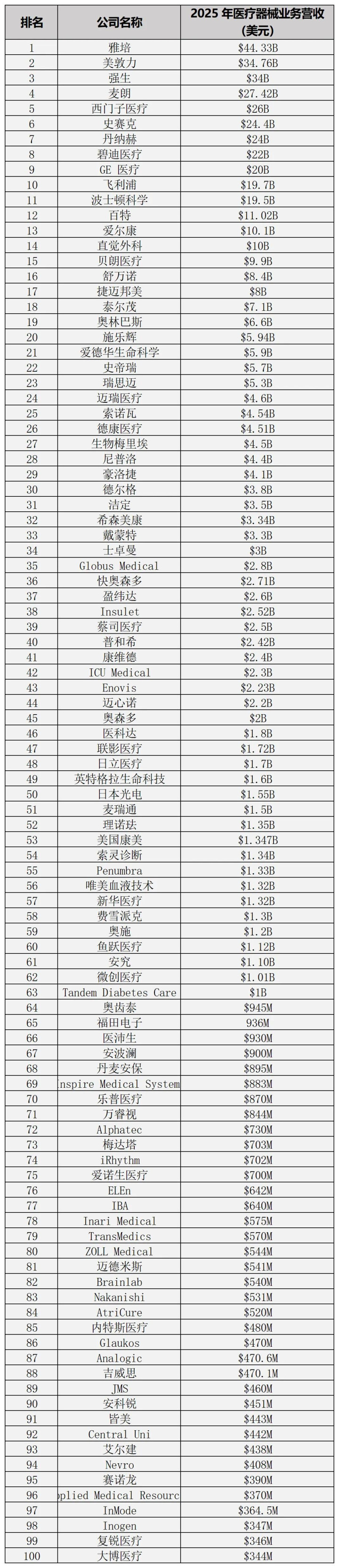 此外,波士顿科学、百特、爱尔康、直观外科等企业分列11-14位,营收均超100亿好意思元,组成了人人医疗器械行业的第二梯队。
