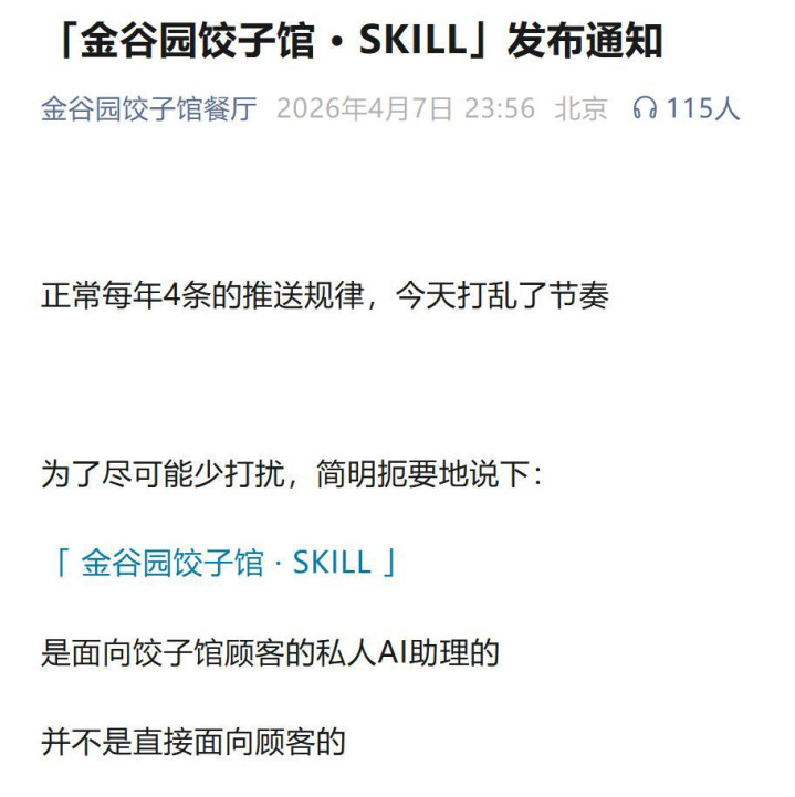 4月7日晚,金谷园饺子馆餐厅在微信公众号发布音信:上线一款AISkill(装置AI技巧的指示),主顾通过我方的AI助手不错查询餐厅、店内Wi-Fi、外卖等信息,甚而还不错在线列队。由此,该饺子馆成为宇宙第一家主动面向Agent(东说念主工智能体)结束列队取号的餐厅。