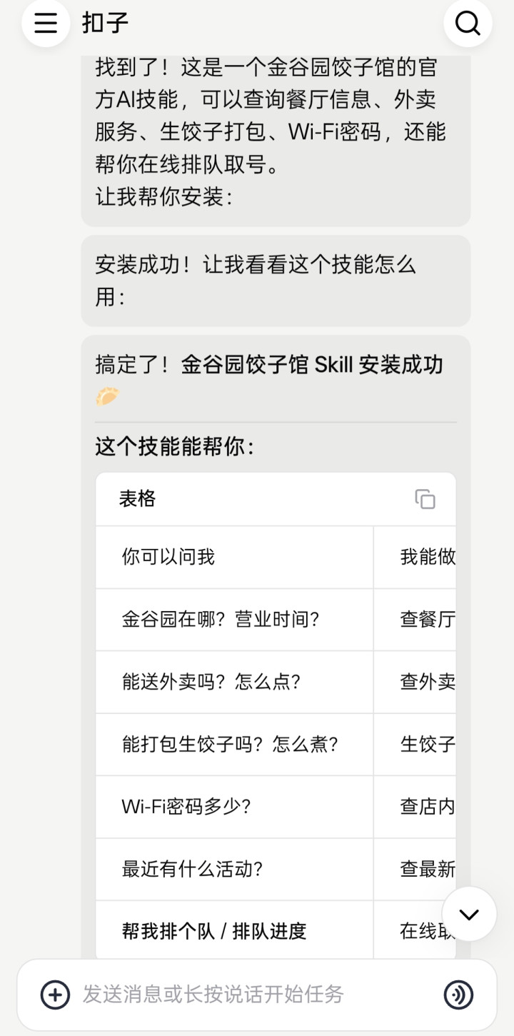 13日下昼,记者实测通过Coze输入饺子馆的Skill指示,即可装置AI技巧,并对金谷园饺子馆的诸多信息进行查询:在哪吃、几点开门、怎样列队、能不行点外卖、生饺子怎样煮、Wi-Fi密码是什么。