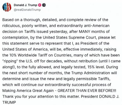 2月20日,好意思国最高法院裁定总统特朗普依《国外伏击经济权柄法》实施的关税犯警。特朗普速即征引《1974年生意法》第122条,晓喻对人人输好意思商品加征10%关税,为期150天。21日,他再将税率上调至 15%。