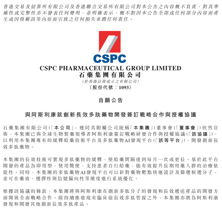 1月30日,石药集团文书与阿斯利康坚韧战术研发相助与授权契约,以愚弄石药集团独有的缓释给药工夫平台及多肽药物AI发现平台征战蜕变长效多肽药物。