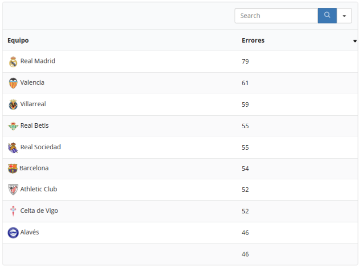 后来是毕尔巴鄂竞技和塞尔塔,均为52次;阿拉维斯与赫塔费为46次。